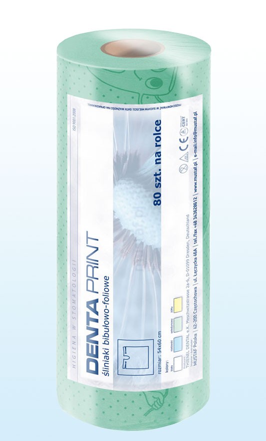 Śliniaki wiązane Denta-Print zielone 54x60cm rolka 80szt. Mustaf bibulowo-foliowe z nadrukiem
