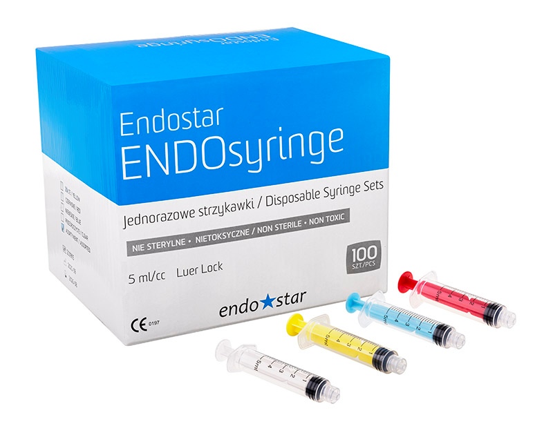 Małe strzykawki do irygacji Endostar o pojemności 5 ml to praktyczne i wygodne rozwiązanie do codziennej pracy. Wyposażone w standardowe mocowanie Luer Lock, zapewniają stabilne i bezpieczne połączenie z igłami oraz innymi akcesoriami. Zestaw zawiera strzykawki w czterech kolorach (przezroczystym, niebieskim, czerwonym i żółtym), co ułatwia organizację pracy i pozwala na szybkie rozróżnienie używanych roztworów. Kolorowe oznaczenie minimalizuje ryzyko pomyłek oraz zwiększa bezpieczeństwo podczas płukania. Kompaktowy rozmiar sprawia, że strzykawki są wygodne w użyciu, także podczas pracy pod mikroskopem. Produkt dostępny w opakowaniu zbiorczym zawierającym 100 sztuk.