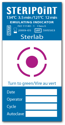 Steripoint™ - test emulacyjny klasy VI. Charakteryzuje go wysoka precyzja określania czasu zmiany barwy w trakcie sterylizacji, czytelność wyniku oraz powtarzalność. Został opracowany i wyprodukowany z zastosowaniem wysokiej jakości nietoksycznego tuszu. Reaktywny tusz jednoznacznie i natychmiastowo zmienia barwę z fioletowej na zieloną, dając wyraźną informacje o prawidłowo przeprowadzonej sterylizacji. Jest to możliwe jedynie wówczas, gdy została osiągnięta wzajemna zależność temperatury i czasu w suchej parze nasyconej. (Zmiana barwy wskaźnika zostaje powstrzymana, gdy jeden z trzech parametrów cyklu jest niewystarczający.) Umieszczenie wskaźnika w pakiecie lub na tacy pozwoli stwierdzić, czy para wodna o odpowiedniej jakości spenetrowała pakiet docierając do miejsca, w którym znajduje się wskaźnik. Test nie zawiera ołowiu i jest nietoksyczny, bezpieczny w użyciu oraz przyjazny dla środowiska. Jest zgodny wg PN-EN ISO 11140-1 w klasie VI. Nadaje się do stosowania w cyklach sterylizacji parowej o parametrach 121°C - 134°C, w tym: 134°C, 3,5 min / 121°C, 15 min; 134°C, 5,3 min / 121°C, 15 min; 134°C, 7 min / 121°C, 20 min; 134°C, 18 min.