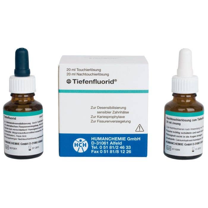 Tiefenfluorid to wysoce skuteczny preparat stomatologiczny przeznaczony do głębokiej fluoryzacji tkanki zęba. W przeciwieństwie do tradycyjnych lakierów i żeli, produkt ten działa w oparciu o reakcję dwufazową, która prowadzi do powstania mikrokrystalicznego osadu w głębi porów szkliwa i wewnątrz kanalików zębinowych. Zapewnia to długotrwałą i intensywną ochronę przed próchnicą oraz natychmiastowe zniesienie nadwrażliwości. Mechanizm działania (Technologia Dwufazowa) Płyn nr 1 (Preparat do zwilżania): Zawiera jony fluoru, magnezu i krzemu. Wnika głęboko w pory szkliwa i kanaliki zębinowe. Płyn nr 2 (Preparat do pędzlowania): Roztwór wodorotlenku wapnia. Po nałożeniu na fazę pierwszą zachodzi reakcja chemiczna, w wyniku której wytrącają się submikroskopijne kryształy fluorku wapnia, fluorku magnezu i żelu kwasu krzemowego. Osad ten wypełnia wolne przestrzenie, tworząc barierę o bardzo wysokim stężeniu jonów fluoru, która utrzymuje się w tkance nawet do roku. Kluczowe korzyści i właściwości : Skuteczność 100-krotnie wyższa: Wytworzone kryształy są znacznie mniejsze niż w przypadku zwykłej fluoryzacji, co pozwala na ich trwałe zakotwiczenie w strukturze zęba. Natychmiastowe znoszenie nadwrażliwości: Idealny do leczenia obnażonych szyjek zębowych oraz po zabiegach wybielania lub profesjonalnego czyszczenia. Remineralizacja szkliwa: Skutecznie wspiera leczenie wczesnych zmian próchnicowych (białych plam). Długotrwała ochrona: Zabezpiecza bruzdy i miejsca trudno dostępne przed demineralizacją kwasową. Wydajność: Zestaw 2 x 20 ml pozwala na przeprowadzenie dużej liczby zabiegów, co czyni go ekonomicznym wyborem dla gabinetu.