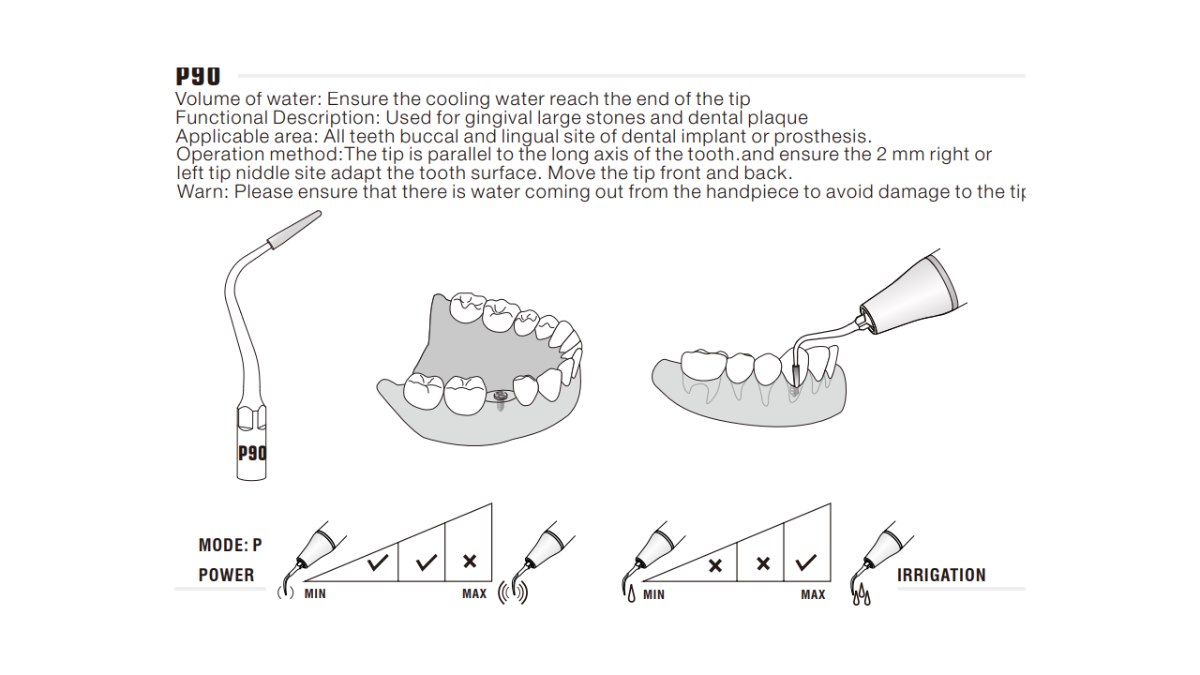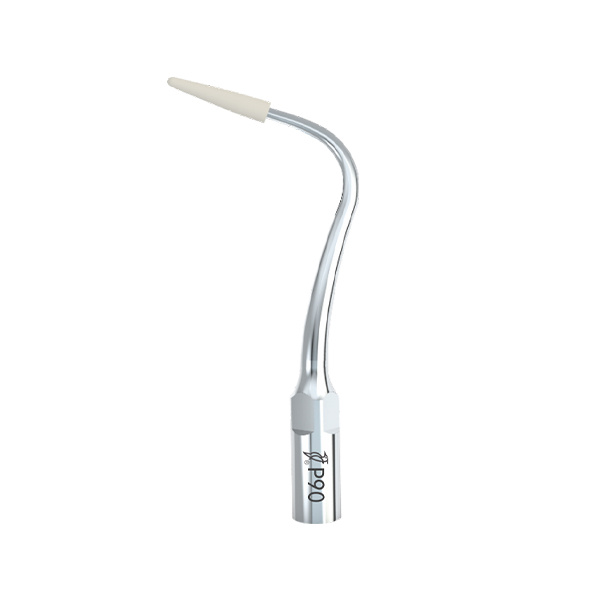 Końcówka ultradźwiękowa Woodpecker P90 to specjalistyczna końcówka do skalingu naddziąsłowego, kompatybilna ze skalerami w standardzie EMS E-Type. Wyposażona w część roboczą wykonaną z Polyetheretherketonu (PEEK), przeznaczona jest do usuwania dużych złogów oraz płytki nazębnej, a także do bezpiecznej pracy w okolicach implantów i uzupełnień protetycznych. Zalety: Przeznaczona do usuwania dużych złogów naddziąsłowych oraz płytki nazębnej. Bezpieczna dla implantów i uzupełnień protetycznych dzięki części roboczej z PEEK. Może być stosowana na wszystkich zębach – powierzchnie policzkowe i językowe. Umożliwia kontrolowaną adaptację ok. 2 mm końcowej części roboczej do powierzchni zęba. Stabilna praca przy zachowaniu ciągłego chłodzenia wodnego. Możliwość wielokrotnej sterylizacji w autoklawie. Ekonomiczne rozwiązanie o wysokim standardzie wykonania. Cechy: Profil zastosowania: P – periodontologia / higienizacja. Część robocza wykonana z Polyetheretherketonu (PEEK). Konstrukcja przeznaczona do pracy naddziąsłowej. Zalecana technika pracy: końcówka ustawiona równolegle do długiej osi zęba, ruchy przód–tył. Standard złączki: EMS E-Type. Wymagane zapewnienie wypływu wody z rękojeści podczas pracy. Informacje techniczne: Typ: P90. Zastosowanie: usuwanie dużych złogów naddziąsłowych i płytki; praca na wszystkich zębach oraz na powierzchniach policzkowych i językowych implantów i uzupełnień protetycznych. Kompatybilność: skalery ultradźwiękowe w standardzie EMS E-Type (m.in. EMS, Woodpecker UDS, Mectron w standardzie E-Type). Materiał części roboczej: Polyetheretherketon (PEEK). Chłodzenie: wymagany stały dopływ wody do końca końcówki. Sterylizacja: autoklaw (zgodnie z zaleceniami producenta).