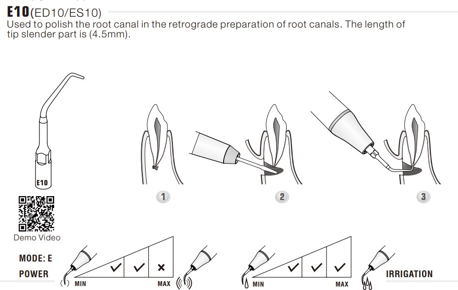 Końcówka ultradźwiękowa Woodpecker E10D to specjalistyczne narzędzie przeznaczone do sondowania kamienia poddziąsłowego, skalingu poddziąsłowego oraz wygładzania powierzchni korzeni (root planing). Model pracuje w standardzie EMS E-Type i jest przeznaczony do pracy ze stałym chłodzeniem wodnym – woda musi docierać do końca końcówki roboczej. Zalety: Przeznaczona do sondowania kamienia poddziąsłowego. Umożliwia skaling poddziąsłowy oraz root planing. Może być stosowana na wszystkich zębach – powierzchnie policzkowe i językowe. Stabilna transmisja drgań ultradźwiękowych. Możliwość wielokrotnej sterylizacji w autoklawie. Ekonomiczne rozwiązanie o wysokim standardzie wykonania. Cechy: Profil zastosowania: E (oznaczenie producenta). Standard złączki: EMS E-Type. Geometria umożliwiająca adaptację około 2 mm końcowej części do powierzchni zęba. Przeznaczona do pracy równolegle do długiej osi zęba. Zalecany ruch roboczy przód–tył. Wymaga zapewnienia stałego dopływu wody do końca końcówki. Wykonana ze stali nierdzewnej medycznej. Informacje techniczne: Typ: E10D. Zastosowanie: sondowanie kamienia poddziąsłowego, skaling poddziąsłowy, wygładzanie powierzchni korzeni (root planing). Obszar pracy: wszystkie zęby – powierzchnie policzkowe i językowe. Standard / typ złączki: EMS E-Type. Sterylizacja: autoklaw (zgodnie z zaleceniami producenta).