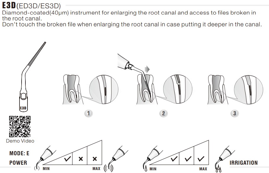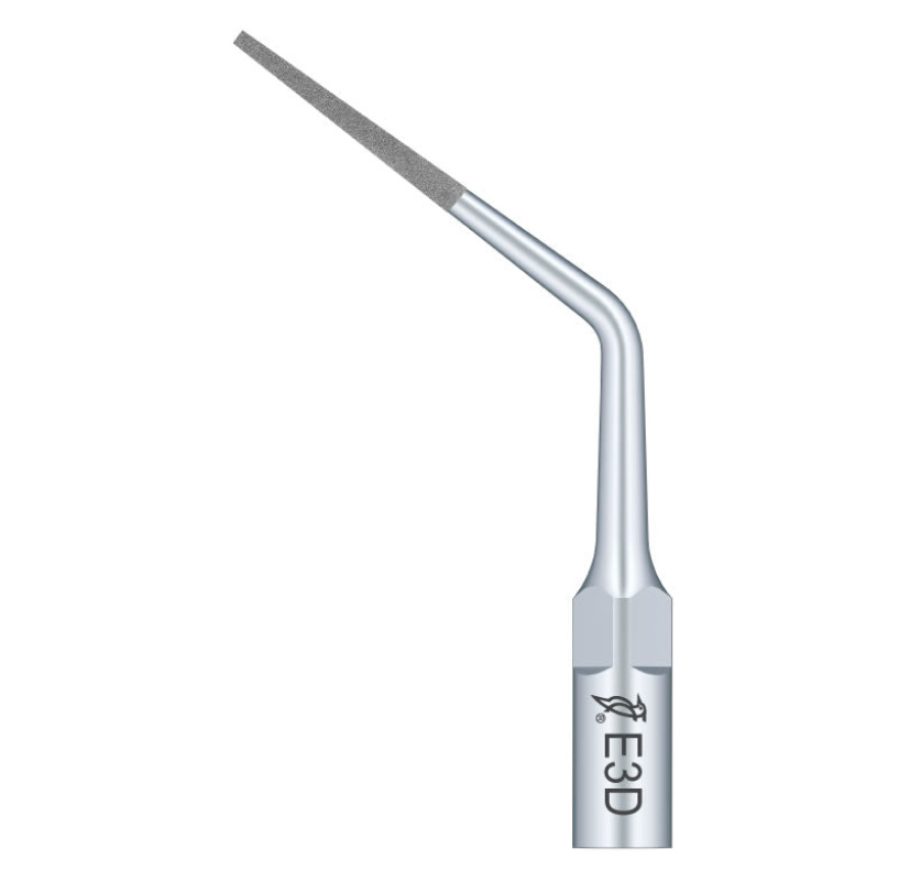 Końcówka ultradźwiękowa Woodpecker E3D to specjalistyczne narzędzie endodontyczne z nasypem diamentowym 40 µm, przeznaczone do uplastyczniania gutaperki podczas wypełniania kanału korzeniowego. Oznaczenie „E” wskazuje na zastosowanie w endodoncji, natomiast litera „D” po cyfrze oznacza pokrycie diamentowe części roboczej. Zgodnie z informacją producenta model E3D rekomendowany jest do uplastyczniania gutaperki (melting gutta-percha) z wykorzystaniem drgań ultradźwiękowych. Zalety: Rekomendowana do uplastyczniania gutaperki (melting gutta-percha). Umożliwia kontrolowaną kondensację materiału wypełniającego w kanale korzeniowym. Nasyp diamentowy 40 µm zwiększający odporność części roboczej na zużycie. Stabilna transmisja drgań ultradźwiękowych sprzyjająca przewidywalnej pracy. Możliwość pracy z irygacją. Możliwość wielokrotnej sterylizacji w autoklawie. Ekonomiczne rozwiązanie o wysokim standardzie wykonania. Cechy: Profil zastosowania: E – endodoncja. Wariant konstrukcyjny: 3. Powłoka robocza: diamentowa 40 µm. Standard złączki: EMS E-Type. Wykonana ze stali nierdzewnej medycznej z nasypem diamentowym. Informacje techniczne: Typ: E3D. Zastosowanie: uplastycznianie gutaperki (melting gutta-percha) i kondensacja materiału podczas wypełniania kanałów korzeniowych. Zalecenia producenta: przed wprowadzeniem do kanału instrument należy zanurzyć w eugenolu; po umieszczeniu w kanale delikatnie docisnąć do stożka gutaperki i aktywować skaler do momentu wypełnienia kanału; nie stosować nadmiernego nacisku osiowego. Standard / typ złączki: EMS E-Type. Kompatybilność: skalery ultradźwiękowe w standardzie EMS (m.in. EMS, Woodpecker UDS, Mectron w standardzie E-Type). Powłoka robocza: diamentowa 40 µm. Sterylizacja: autoklaw (zgodnie z zaleceniami producenta).
