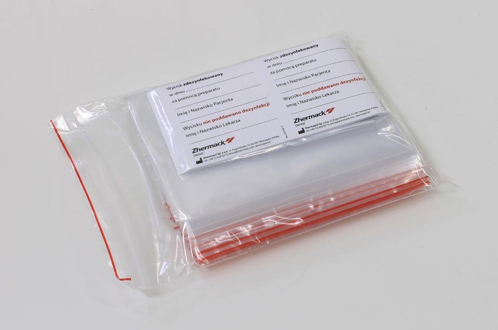 Torebki do przechowywania i przewożenia wycisków. Zapobiegają wysychaniu masy w pobranych wyciskach. Posiadają zamknięcie na żyłkowy zacisk, które ułatwia otwieranie i zamykanie torebki bez jej uszkodzenia. uzupełnienie: 1 sztuka opakowanie zawiera 50 torebek