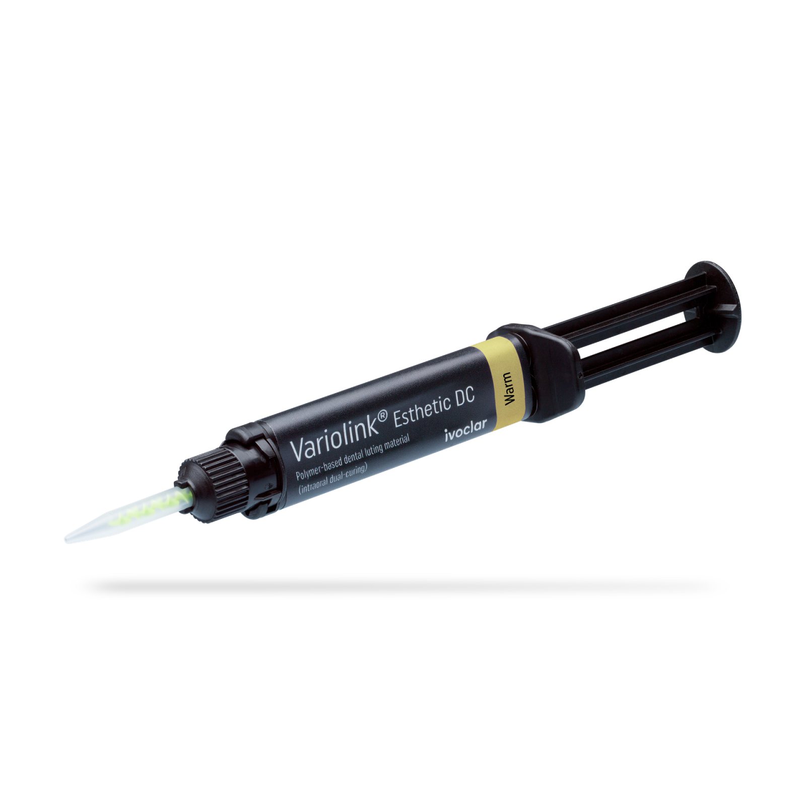 Variolink Esthetic DC - estetyczny, dualnie wiążący cement kompozytowy. Przeznaczony jest do ostatecznego cementowania ceramicznych i kompozytowych uzupełnień protetycznych stałych. Oparty jest na bazie estetycznych, doskonałych jakościowo i klinicznie sprawdzonych cementów Variolink II i Variolink Veneer. Reprezentuje nową generację cementów kompozytowych zapewniając doskonałą estetykę i przyjazny dla użytkownika sposób stosowania. Jego zalety to: - doskonała stabilność odcieni dzięki zastosowaniu opatentowanego fotoinicjatora polimeryzacji -Ivocerin, który nie zawiera ko-inicjatorów w postaci amin - zrównoważony i zwięzły system doboru koloru „Effect shade system” - naturalna fluorescencja materiału - możliwość rozjaśnienia lub przyciemnienia pola protetycznego lub użycia koloru transparentnego bez wpływu na odcień - łatwy i precyzyjny sposób usuwania nadmiarów po wstępnej polimeryzacji - konsystencja materiału - idealne połączenie płynności i stabilności cementu dzięki regulatorowi lepkości - doskonały kontrast na zdjęciach rentgenowskich. Wskazania: ostateczne osadzanie: - uzupełnień wykonanych z ceramiki szklanej, dwukrzemianu litu lub materiałów złożonych (uzupełnień typu inlay, onlay i licówek) - uzupełnień o grubości tylko <2 mm, wykonanych z materiału o odpowiedniej przezierności, który zapewni dostęp światła (np. IPS e.max HT) uzupełnienie: strzykawka Automix 5g w odcieniu Warm