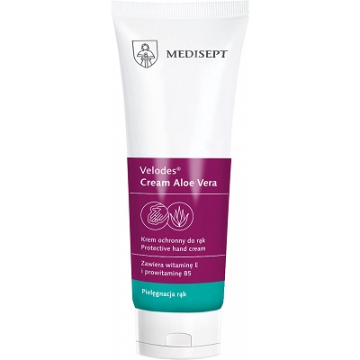 Cechy produktu: - Doskonale nawilża, pielęgnuje i chroni skórę dłoni - Zawiera prowitaminę B5, witaminę E, i ekstrakt z aloesu - Nawilża, uelastycznia i niweluje uczucie szorstkości - Zapewnia dłoniom jedwabistą gładkość - Zalecany jest do codziennego stosowania - Przebadany dermatologicznie - Zgłoszenie do CPNP Sposób użycia: Niewielką ilość kremu wmasować w skórę dłoni i paznokcie. Czynność powtarzać 2-3 razy dziennie. Opakowanie: tuba 100 ml Zastosowanie: Velodes® Cream Aloe Vera doskonale nawilża, pielęgnuje skórę dłoni i chroni ją przed niekorzystnym wpływem czynników zewnętrznych. Bogata formuła, zawierająca glicerynę, ekstrakt z aloesu, prowitaminę B5 i witaminę E sprawia, że skóra dłoni jest miękka i jedwabista. Zalecany jest do codziennego stosowania po częstym myciu rąk oraz po higienicznej dezynfekcji. Szczególnie zalecany dla lekarzy, personelu medycznego oraz osób narażonych na wysuszenie i macerację skóry w wyniku częstego mycia i noszenia rękawic. PRZEBADANY DERMATOLOGICZNIE