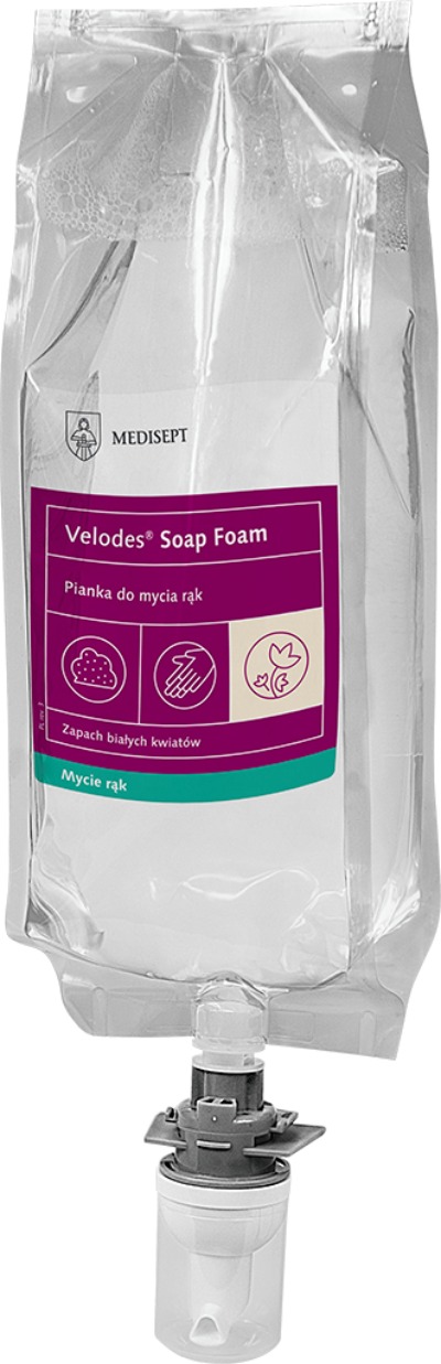 Velodes® Soap Foam to wysokiej jakości produkt w formie delikatnej pianki, zaprojektowany z myślą o osobach wymagających częstego i skutecznego mycia rąk. Dzięki starannie opracowanej recepturze, preparat łączy doskonałe właściwości czyszczące z intensywną pielęgnacją skóry, pozostawiając na niej subtelny zapach białych kwiatów. Cechy : Formuła pianki: Gotowa do użycia postać piany skraca czas mycia i znacząco zwiększa wydajność produktu w porównaniu do tradycyjnych mydeł w płynie Pielęgnacja i ochrona: Zawartość gliceryny oraz pochodnej oleju kokosowego zapewnia skórze odpowiednie nawilżenie, tworząc barierę ochronną przed wysuszeniem Neutralne pH: Odczyn zbliżony do naturalnego pH skóry sprawia, że produkt jest niezwykle łagodny i może być stosowany nawet przy skórze wrażliwej i skłonnej do podrażnień.