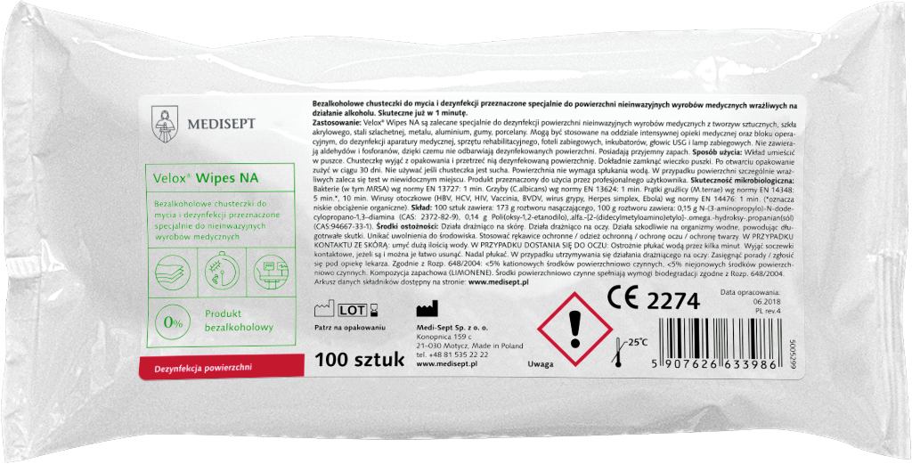 Chusteczki Velox NA przeznaczone są do powierzchni wrażliwych na działanie alkoholu. Posiadają szerokie spektrum mikrobójcze, działają już w czasie 1 min na: - bakterie (w tym MRSA) wg EN 14885; EN 1040; EN1276, EN 13697: 30 sekund (niski stopień zanieczyszczeń), 1 minuta (wysoki stopień zanieczyszczeń). - wirusy osłonkowe (np.:HBV, HIV, HCV, HDV, HIV, wirusa grypy A, B, C, BVDV, Vaccinia wg EN 14885, BGA(RKI), DVV: 1 minuta (wysoki stopień zanieczyszczeń). - wirus Rota wg EN 14885, BGA(RKI), DVV: 1 minuta (wysoki stopień zanieczyszczeń). - wirus Noro wg EN 14885; EN 14476: 30 min. (niski stopień zanieczyszczeń) - grzyby (C. albicans) wg EN 14885, EN 1275, EN 1650, EN 13697: 30 sekund (niski stopień zanieczyszczeń), 1 minuta (wysoki stopień zanieczyszczeń). Nie zawierają aldehydów i fosforanów, dzięki czemu nie odbarwia dezynfekowanych powierzchni. Zalecane do mycia i dezynfekcji sprzętu medycznego ze szkła, porcelany, metalu, gumy, tworzyw sztucznych oraz szkła akrylowego. Mogą być stosowane: - na oddziale intensywnej opieki medycznej oraz bloku operacyjnym, - do dezynfekcji aparatury medycznej, sprzętu rehabilitacyjnego, foteli zabiegowych, inkubatorów, głowic USG i lamp. opakowanie: 100 sztuk