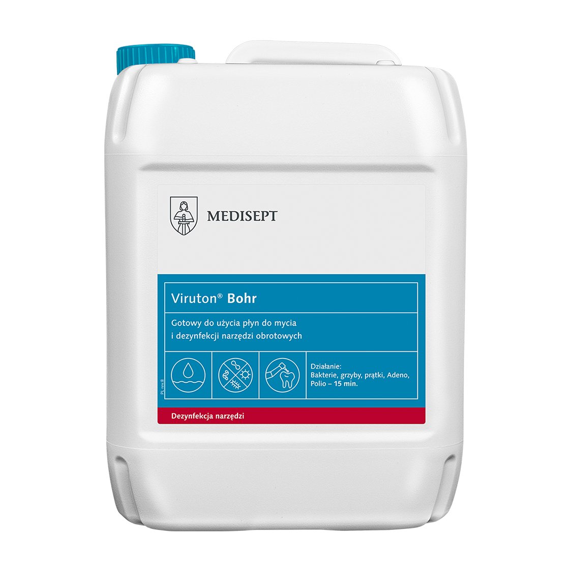 Viruton Bohr – bezaldehydowy, gotowy do użycia preparat do mycia i dezynfekcji narzędzi obrotowych. Zalecany jest do dezynfekcji: - wierteł, frezów kostnych ze stali, twardych metali, - instrumentów z nasypem diamentowym, - narzędzi ściernych i polerujących takich jak gumki silikonowe, płytki ceramiczne, kamienie; - narzędzi do leczenia kanałowego. Zawiera inhibitor korozji, dzięki czemu idealnie chroni instrumenty ze stali i stopów metali. Może być stosowany do narzędzi z aluminium. Posiada niskie pH, bardzo dobre właściwości myjące, również w przypadku zaschniętych pozostałości organicznych. Wykazuje szerokie spektrum mikrobójcze: bakterie, prątki, grzyby, wirusy (w tym Adeno i Polio). Gwarantuje skuteczne i bezpieczne stosowanie oraz wysoką redukcję ryzyka zakażenia Może być stosowany poprzez zanurzenie w wannie do dezynfekcji lub w myjce ultradźwiękowej. Został przebadany zgodnie z nowymi normami dla środków dezynfekcyjnych (EN 14885) Skuteczność mikrobiologiczna (dla wysokiego ograniczenia organicznego): Bakterie (w tym MRSA) wg norm: EN 13727: 15min, EN 14561: 15min, Grzyby wg norm: EN 13624: 15min, EN 14562: 15min, Prątki gruźlicy (M. terrar, M.avium) wg norm: EN 14348: 15 min, EN 14563: 15 min. Wirusy osłonkowe (w tym HBV, HIV, HCV, Vaccinia, BVDV, Ebola) wg normy EN 14476: 15mi Wirus Adeno wg normy EN 14476: 15min Wirus Polio wg normy EN 14476: 15min opakowanie: kanister 5L Sposób użycia: Narzędzia bezpośrednio po użyciu zanurzyć w nierozcieńczonym preparacie. Starannie zanurzyć wszystkie elementy. Po określonym czasie działania narzędzia wyjąć z wanienki lub myjki, wypłukać w wodzie i osuszyć jednorazową serwetką. W razie widocznych zanieczyszczeń usunąć je szczoteczką, a dezynfekowany wyrób zanurzyć ponownie w preparacie. Po osuszeniu czyste narzędzia poddać sterylizacji. Skład 100g zawiera: 0,15g N-(3-aminopropylo)- N -dodecylopropano-1,3–diamina, 0,14g Poli(oksy-1,2-etanodilo),.alfa.-[2-(didecylmetyloamino)etylo]-.omega.-hydroksy-, propanian(sól).
