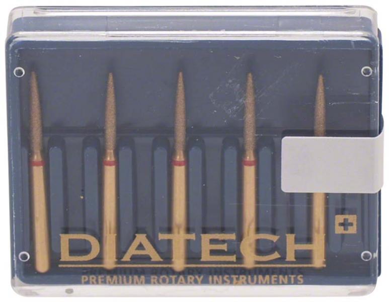 Wiertło na turbinę z wielowarstwowym nasypem diamentowym, płomyk długi. Wykonane jest w zaawansowanym procesie produkcyjnym z wykorzystaniem nowoczesnych technologii. Posiada część pracującą z wysoce efektywnie tnącego, naturalnego nasypu diamentowego ułożonego w różnych płaszczyznach. Zapewnia to efektywną, ciągłą pracę instrumentem oraz precyzyjne cięcie nawet w przypadku odkruszenia się cząstek nasypu, przedłużając tym samym jego żywotność. Gładki, pozłacany trzpień wykonano ze szlachetnej stali kwaso- i zasadoodpornej, a dokładna kalibracja gwarantuje bezpieczeństwo użytkowania. opakowanie: 5 wierteł na turbinę w rozmiarze 014 nasyp delikatny, czerwony pasek długość części pracującej: 8,0mm