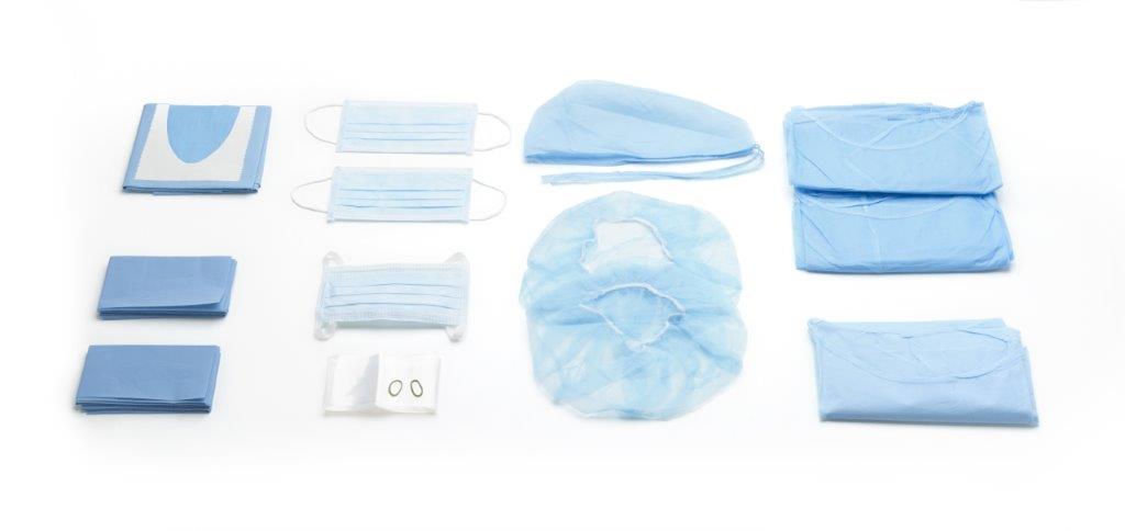 Zestaw sterylnych obłożeń jednorazowego użytku do zabiegów chirurgicznych Zawiera niezbędną dla personelu medycznego odzież ochronną oraz obłożenie dla pacjenta i pola zabiegowego. Elementy kompletu wykonano z włókniny i polietylenu w jasnoniebieskim kolorze. Zawartość kompletu: fartuch z bawełnianymi mankietami (wodoodporny włókninowy), rozm. L (115cm) - 1 szt. fartuch z elastycznymi mankietami (wodoodporny włókninowy), rozm. L (120cm) - 2 szt czepek wiązany (furażerka, włókninowy) - 1 szt czepek z gumką (beret, włókninowy) - 2 szt maseczka Monoart® wiązana, 3-warstwowa antyalergiczna - 2szt maseczka Monoart® z gumką, 3-warstwowa antyalergiczna - 2szt serweta jałowa z wycięciem typu "U" i przylepcem dla pacjenta (włóknina+polipropylen) 75x90cm / wycięcie 11x9 cm - 1szt serweta jałowa (włóknina+polipropylen) 50x75cm - 2szt osłona do rękawa (z przylepcem mocującym), z przezroczystej folii PCV, wymiary 120x7cm - 1szt